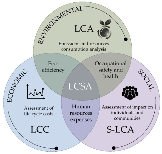 Life-Cycle Sustainability Assessment (LCSA) provides a framework for the sustainability of processes and products from the perspective of all three dimensions of sustainability: environment, economic, and social [98]. The impact of a product or process on the environment component is analyzed by Life-Cycle Assessment methodology (LCA or E-LCA), considering environmental as well as human health effects. Furthermore, the economic dimension is attributed to the Life-Cycle Costing (LCC) methodology, which assesses all the costs associated with the analyzed product or process system. Social Life-Cycle Assessment (S-LCA), on the other hand, analyzes the impact on the social dimension including stakeholders, employees, communities, etc., and it is less developed than LCA and LCC [99]. The methodologies part of the LCSA framework that have been mostly applied so far in research studies are thus Life-Cycle Analysis (LCA) and Life-Cycle Costs (LCC). A schematic representation of the three methodologies comprised by the LCSA framework is included in Figure 5.