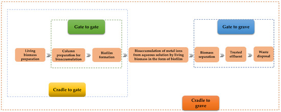 Life-Cycle Assessment (LCA) methodology is a very well-established methodology defined by the standards ISO 14040 and ISO 14044 and includes four main phases of application: goal and scope definition, inventory analysis, impact assessment, and interpretation. The starting point of the LCA analysis is the establishment of the system boundaries. This can be used in several forms: cradle to gate, gate to gate, gate to grave, and cradle to grave (Figure 6). Out of the four potential options, the cradle to grave type of system is the one that includes the input and output emissions and flows from the raw materials to waste disposal [100]. Taking into consideration the lack of environmental impact data regarding the metal removal from wastewaters using microorganisms in column systems, studies approaching any of the possible system boundaries options can bring added value at this point.