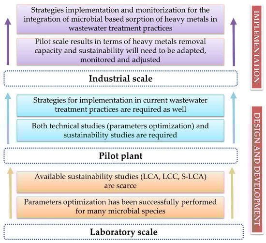 It is worthwhile to consider that the use of microalgae in comparison with bacteria and fungi could have a lower environmental impact in wastewater treatment, especially for global warming impact categories, due to the fact that these microorganisms are photosynthetic and thus contribute to climate change mitigation. An LCA study on the impact of microalgae cultivation for bio-oil extraction and pyrolysis processing revealed that for 1 ton of cultivated microalgal biomass, 220 kg of CO2 are removed from the atmosphere through photosynthesis. Furthermore, comparing the microalgae cultivation with terrestrial plants cultivation (soybean and canola seed), a negative value was generated in the case of microalgae use (−222 CO2 equivalent), thus environmental savings were recorded for the impact category of global warming, whereas in the case of the plants use, a positive value was generated (243.3 and 738.5 CO2 equivalent, respectively). The value of the water use impact category was much higher though for microalgae cultivation [108]. Thus, to succesfully scale-up the microbial-based metal removal processes, LCA is necessary to be performed in order to have a perspective on the environmental impact of the bioremediation and to ensure minimum negative effects on the natural world [109]. A short overview of the research and technology implementation status regarding the application of LCA, S-LCA, and LCC for the analysis of microbial-based heavy metals removal using microorganisms, from laboratory to industrial scale, is shown in Figure 8.