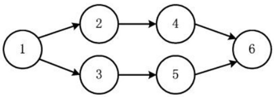 We can visually display the priority dependency of all tasks in the workflow. A simple workflow is shown in Figure 2. There are six tasks in the workflow. The workload and data volume of each task are shown in Table 2. When task 1 runs, tasks 2 and 3 can start to run, while tasks 4 and 5 need to wait for tasks 2 and 3, respectively, to start running. Task 6 cannot be started until task 4 and task 5 are finished. When task 6 is finished, the whole workflow is finished.