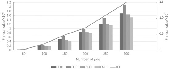 The PSO algorithm is a kind of evolutionary algorithm. It starts from the random solution, searches for the optimal solution through iteration, evaluates the quality of the solution through fitness, and searches for the global optimal value by following the currently searched optimal value. The fitness values of PSO task scheduling algorithms corresponding to the five unloading strategies are compared as shown in Figure 4, in which the Lo algorithm corresponds to the right coordinate axis, and the other algorithms correspond to the left coordinate axis. When the number of tasks changes from 50 to 300, the fitness value of the scheduling scheme based on the emo algorithm is the lowest; when the number of tasks is 50, the other 4 unloading strategies (FOC, foe, EMO) except lo, however, with the increase in the number of tasks, the fitness gap of the 5 unloading strategies is increased. When the number of tasks is 50, the fitness value of emo is 3% lower than that of SPO, and when the number of tasks is 300, the fitness of emo is 8% lower than that of SPO. This shows that the partial offload strategy proposed in this paper is suitable for large-scale task scheduling and management in the mobile edge computing environment.