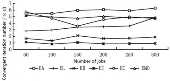 When the number of tasks is 50~300, the optimal scheduling scheme iterations of the 6 inertia weight scheduling algorithms are shown in Table 4. Combined with Figure 7 and Table 4, it can be found that the convergence of the emo algorithm is also stable while finding the optimal solution with a lower fitness value. The convergence of the other five algorithms is not stable enough or easy to fall into local optimum. Therefore, the emo algorithm is better than the other five algorithms in terms of shrinking the optimal solution and convergence.