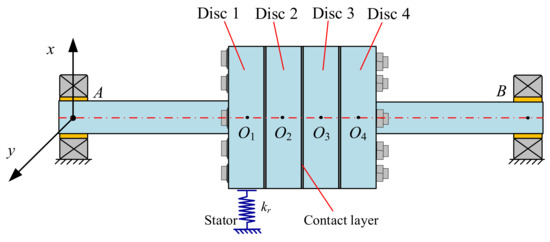 A schematic of a rub-impact multi-disc bolted joint rotor system supported by oil-lubricated bearings is shown in Figure 2, where the discs are fastened together by several long bolts. The lumped mass at two bearings is defined as mA and mB, respectively. mO1, mO2, mO3 and mO4 are the lumped mass of the four discs, and the eccentricities of the discs are defined as e1, e2, e3 and e4, respectively. To study the dynamic properties of the rotor system efficiently, the dynamic model of the multi-disc bolted joint rotor system is simplified according to the assumptions shown below: