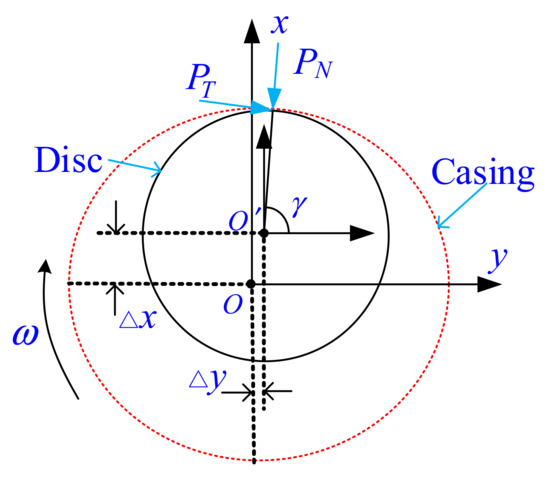 Figure 3 shows the schematic diagram of the disc–stator rub-impact phenomenon with clearance. In this paper, the rotor–stator rubbing fault is a single-point rub-impact, where the tangential friction force meets the Coulomb friction law, and the radial impact meets the linear elastic deformation theory. Therefore, the radial impact force PN and the tangential rub force PT can be represented by [41]: