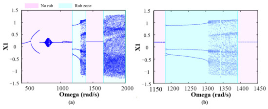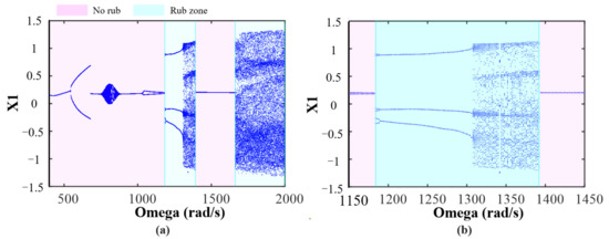 Bifurcation diagrams of disc 1 for the case of disc 4 subjected to rub-impact: (a) ω = [400~2000] rad/s; (b) Local bifurcation diagram.