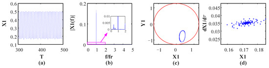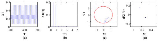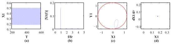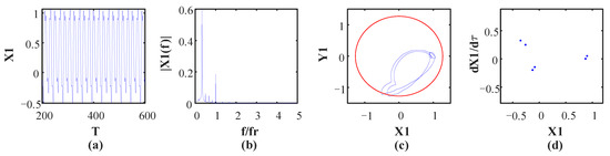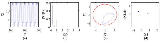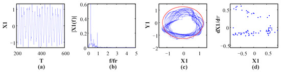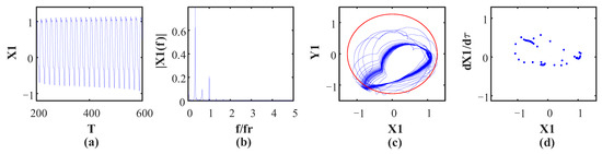 Figure 10 shows the vibration waveform, rotor orbit, frequency spectrum and Poincaré map at ω = 1184 rad/s, and it shows that the system turns into period-6 motion, which can be verified by six isolated points in the Poincaré map and by the fundamental frequency and some subharmonics in the frequency spectrum, as shown in Figure 10c. This is because the oil whip occurs at the current speed, which leads to the subharmonics appearing in the frequency spectrum. Moreover, the rotor orbit exceeds the rubbing boundary, as shown by a red circle, which means that the rubbing fault occurs at the current speed. As speed continues to increase, the motion state turns into period-3 motion at ω = 1190 rad/s. There are three points illustrated in the Poincaré map (Figure 11d), and the fundamental frequency and its 1/2 and 1/3 subharmonics can be observed in the frequency spectrum because the oil whip phenomenon still occurs at the current speed. (Figure 11b). In Figure 12d, there are many points of disordered distribution in the Poincare map at ω = 1308 rad/s, indicating that the system enters chaotic motion. Therefore, the rotor system presents the period-3 motion state within the interval of 1190 rad/s < ω < 1306 rad/s. When the rotational speed reaches 1394 rad/s, inverse period-doubling bifurcation occurs, and the system leaves chaotic motion and turns into period-1 motion. Moreover, the bifurcation diagram depicted in Figure 5 shows that only one point is illustrated within 1394 rad/s < ω < 1660 rad/s. Finally, the system enters chaotic motion from period-1 motion at ω = 1662 rad/s, which is demonstrated by numerous disordered points in the Poincaré map and continuous frequency bands in the spectrum, as shown in Figure 13. This is because of the severe vibration introduced by the rubbing fault and the continuous frequency bands that appear in the frequency spectrum, resulting in the system entering a chaotic motion state.