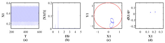 Numerical integration results at ω = 1046 rad/s: (a) Time domain waveform; (b) Frequency spectrum; (c) Shaft orbit; (d) Poincaré map.