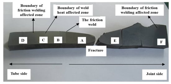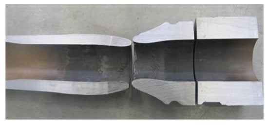 The fracture failure accident of 101.6 mm drill pipe occurred in a certain well during drilling operation. The morphology of the failed drill pipe sample was shown in Figure 1a. The distance between the joint torque shoulder surface and the fracture position is about 265 mm; the distance between the torque shoulder surface and the slope shoulder of 35° is about 212 mm, and; the outer diameter of the drill pipe joint is 132.8 mm. The shoulder chamfering diameter is 127.48 mm and the inner diameter is 61.5 mm. The side of the tube body at the fracture is bright white with obvious friction marks. The outer diameter at the fracture is about 79.4 mm, the inner diameter is about 64.8 mm, the outer diameter of the tube body is about 101.8 mm, and the outer diameter of the thickening part of the tube body is about 105.5 mm. Friction and wear marks on the 35° slope shoulder of the drill pipe joint are evident with some hard adhesives attached. There are also obvious friction and wear phenomena at the drill pipe joint body, and there are many mud erosion marks (Figure 1b,c) on the outer surface circumference near the arc groove. It is worth noting that some tongs indentation was indeed found on the failed drill pipe joint, but these bite marks were shallow and did not affect the structural integrity and strength of the joint, and no obvious bite marks were found at the fracture position of the failed drill pipe. Therefore, the indentation caused by the fit out and disassembly of the joint is not the main cause of this failure. In addition, when the failed sample was cut open as displayed in Figure 2, the inner wall of the sample near the fracture showed obvious marks of high-temperature burning, and the coating was seriously discolored and fell off.