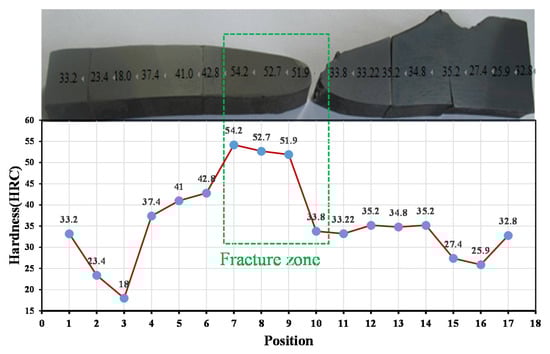 After sampling and cleaning the failed drill pipe, it was found that the fracture was located at the joint body approximately 36.4 mm from the weld. There are two distinct thermal effect boundaries symmetrically distributed on both sides of the fracture surface of the sample, which are consistent with the trace line of the discoloration position of the inner coating. Figure 3 shows the partition and numbering of the failed samples, it is clear that there is necking phenomenon due to tensile yield in zone A and zone E. Figure 4 demonstrates the analysis results of metallographic structure in different zones, it can be seen from Figure 4 that there are a lot of martensite and bainite and tempered sorbite in the material near the fracture. However, with the increase in the distance from the fracture, the content of martensite decreases and the tempered soxtensite increases. Figure 5 shows the hardness test results of the failed sample; it can be seen that the hardness of the material near the fracture is obviously higher than that far away from the fracture.