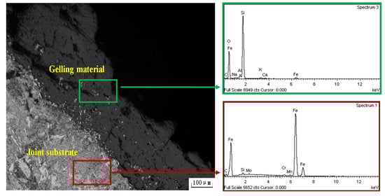 Energy spectrum analysis was performed near the fracture, as shown in Figure 6. It is clear that there are many black adhesives near the joint and a large number of white particles on the surface of the matrix. The main components of the black adhesive are Si and O, as well as some elements such as Ca and Na. The main components of the white particles in the adhesive are Fe and O. It can be concluded that the black adhesive is mainly silicon dioxide and silicate, and the white particles in the adhesive are the peeling metal particles and corrosion products on the drill pipe joint matrix.