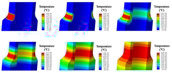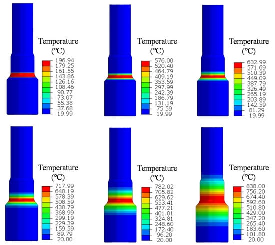 In the actual drilling operation, according to the 5530 m depth of wellbore, the hydrostatic pressure of drill pipe environment can be calculated as 81.3 MPa. Due to the obvious pressure drop of drilling fluid during the process of drilling fluid passing through the drill bit and then returning from the wellbore, the internal pressure of drill pipe can be calculated as 92.8 MPa according to Bernoulli equation. At the same time, the drill pipe is subjected to axial loads from the upper drill pipe and the formation. When the drill pipe rotates, the sedimentary gravel in the wellbore will rub against the friction welding area of the drill-pipe joint, resulting in friction heat, changing the thermal stress of the drill pipe material, resulting in metal phase transformation, reducing the strength of the drill pipe, and ultimately leading to fracture failure of the drill pipe. When the drill pipe rotation speed is 60 rpm, the temperature-distribution contour diagram of the friction area between the drill pipe and gravel advancing over time is shown in Figure 10. It can be seen that the highest temperature occurs in the friction welding area of drill pipe where the outer wall of drill pipe is in contact with the sedimentary gravel, and gradually decreases to both ends, and the maximum temperature of the outer wall of drill pipe reaches 838 °C. At the same time, the lowest temperature was found at both ends of the drill pipe, with a minimum temperature of 20 °C. The temperature change of the outer wall of the drill pipe follows the following steps: (i) At the initial stage of friction, a high temperature zone is generated at the contact area between the outer wall of the drill pipe and the gravel, but the temperature change does not extend across the drill pipe; (ii) As time goes on, the temperature in the friction region further increases and the temperature variation region expands, but the high temperature region becomes more concentrated; (iii) Later, the high temperature zone also began to expand, and the temperature variation zone extended to a larger area of the drill pipe. From the analysis of the temperature level and distribution with time, it can be seen that at the beginning of the contact friction between the drill pipe and gravel, the temperature of the outer wall of drill pipe begins to rise due to the heat generated by friction. Subsequently, due to the cooling effect of the drilling fluid, the hot zone on the drill pipe began to be concentrated in the friction area, and the temperature continuously spread across the drill pipe. Finally, as the temperature increases, the entire temperature range expands across the drill pipe.