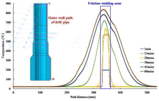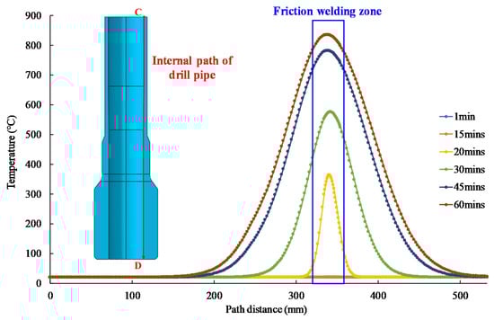 The axial temperature distribution curves of the outer and inner walls of the drill pipe were extracted by defining paths from top to bottom along the inner and outer walls of drill pipe, respectively. Figure 12 displays the temperature distribution of the outer wall of the drill pipe at different times. It can be seen that as time goes on, the maximum temperature on the drill pipe becomes higher and higher. In the initial friction, the temperature changes only in the contact area, and then gradually spreads to the whole friction welding area and even other areas. After 60 min of friction between the drill pipe and the gravel, the highest temperature on the outer wall of the drill pipe reached 838 °C.