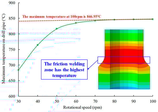 As a factor that can be controlled in the actual drilling process, the rotational speed also has a great influence on the heat generated by the friction between the friction welding area of the drill pipe and gravel deposited in the wellbore. By controlling the drilling speed of the drill pipe in the finite element model, the friction heat generation between the drill pipe and the gravel was simulated under different rotation speed conditions. The relationship between the maximum temperature on the drill pipe and the variation in rotational speed is shown in Figure 14. The process of increasing the maximum temperature on drill pipe can be divided into two stages: (i) When the drill pipe speed is lower than 50 rpm, the maximum temperature on the drill pipe increases with the increase in the rotation speed rapidly. For example, when the drill pipe speed is 30 rpm, the maximum temperature on the drill pipe is 684 °C, while when the drill pipe speed is 50 rpm, the maximum temperature is 816 °C; (ii) When the drill pipe rotation speed is higher than 50 rpm, the increasing trend of the maximum temperature on the drill pipe gradually becomes slow. When the drill pipe rotation speed is 100 rpm, the maximum temperature is 847 °C, compare with the maximum temperature under the condition of 50 rpm, the increase is slight. Therefore, it can be seen from the analysis of the law that, in the actual underground drilling process, if sand and gravel deposition occurs in the wellbore, the rotational speed of the drill pipe can be artificially controlled to avoid the phase transition of metal and the reduction of strength of the drill pipe caused by the high friction temperature. Based on the results of this study, we recommend that the rate of penetration should be artificially controlled at around 50 rpm during drilling. At the same time, it is recommended that the drilling time should not exceed 60 min, and switching the drill pipe in time and cooling down. Meanwhile, keeping a clean hole and drilling fluid circulation are effective measures to prevent such failure.