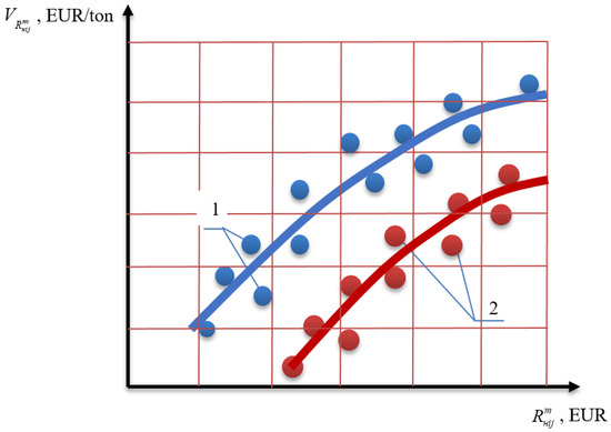 Figure 2 presents the value model of projects that claim to be included in effective technologically integrated projects, which is based on known cost levels () for project implementation and unit values () according to the level of costs and the given level of their consideration.