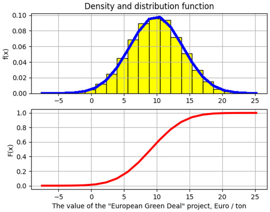 Statistical processing of the obtained data on the distribution of the projected specific value () for project No. 1 for the procurement of raw materials from corn waste allowed the determination of the numerical characteristics and the justification of the model (Figure 4), which are described by the normal distribution law with a differential function:
