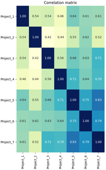 In addition, we conducted a rank correlation between the specific value of the considered projects of the procurement of raw materials from corn waste, the results of which are presented in Figure 5. The obtained correlation matrix of the specific value of projects indicates that a strong relationship according to this criterion was observed between projects No. 7 and No. 5, for which the correlation coefficient was , and between projects No. 7 and No. 6, for which the correlation coefficient was . This shows that the No. 7 project had the greatest value relationships in the technologically integrated “European Green Deal” projects for the production of clean energy from corn waste.
