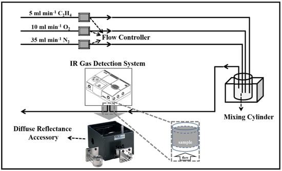 The composition of the reactant mixture was adjusted by adjusting the flow rates of C2H4, O2, and N2, meanwhile keeping the overall flow rate constant at 1000 mLmin−1. The conditions were consistent with a gas hourly space velocity (GHSV) of 600,000 mL gcat.−1 h−1. The composition of the effluent gases was monitored online using a Fourier-transform infrared (FT-IR) gas analyzer (MKS, MultiGasTM analyzer, model 6030) equipped with a liquid-nitrogen cooled mercury-cadmium-telluride (MCT) detector. The cut-off wavelength for the detector was 16 μm, the window type was ZnSe, the detector size was 0.25 mm, and the path length was 5.11 m.