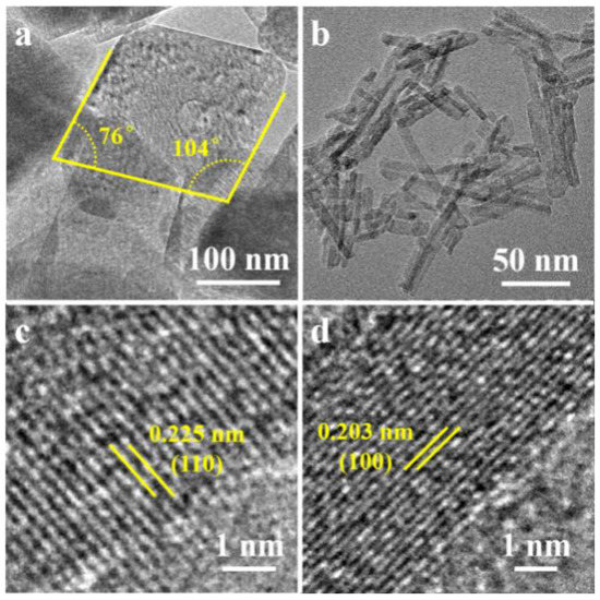 HRTEM observations were subsequently carried out to confirm the microstructural characteristics of the γ-Al2O3 samples which were earlier inferred from the XRD patterns. The sample prepared in part 2.2 using Al3+/AlO2- exhibited highly distributed γ-AlOOH-based nanoflakes. After calcination at 550 °C, γ-AlOOH transformed into γ-Al2O3 [32,33,34], and the TEM image of γ-Al2O3 nanoflake (Al-NF) has been depicted in Figure 3a. The lengths and thickness of the as-prepared Al-NF were about 200 nm and 40 nm, respectively. Besides, the developed nanoflakes manifested straight edges with angles measuring 76° and 104°, which corresponded to the angle between the (101) and (−101) faces of γ-AlOOH [28,29,35], indicating γ-AlOOH nanoflakes grew with basal planes and lateral faces of (010) and (101). The Al-NF therefore directly inherited the morphology of γ-AlOOH nanoflakes and the exposed γ-AlOOH faces (010) and (101) were converted to basal planes and lateral faces of (110) and (111) of γ-Al2O3 by topological rules [36,37]. The highly magnified TEM image of the γ-Al2O3 nanoflake has been shown in Figure 3c. The lattice fringes of Al-NF with a d-spacing of 0.225 nm, corresponding to the (110) plane of γ-Al2O3, can be observed clearly [38]. The protocol described in part 2.3 produced γ-Al2O3 nanowires (Al-NW) as shown in Figure 3b. The lengths and diameters of the as-prepared Al-NW were observed to be 100 nm and 10 nm, respectively. Figure 3d is a representation of HRTEM images where lattice fringes attributed to (100) planes of the γ-Al2O3 phase, can be observed.