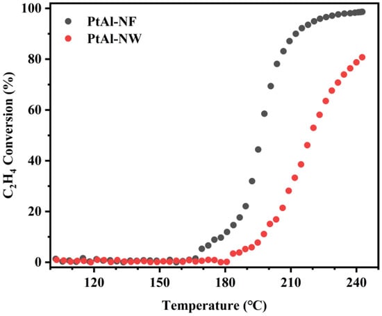 Catalytic conversion of C2H4 using PtAl-NF was accomplished at around 240 °C, using a gas stream containing 0.07% C2H4 and 10% O2 in N2 at a space of 600,000 mL gcat.−1 h−1 (Figure 4). By comparison, the reference sample (PtAl-NW) achieved 80% C2H4 conversion, which was 20% lower than the PtAl-NF catalyst at 240 °C. Pt has been accepted as the active phase in this reaction, in which γ-Al2O3 only served as a carrier and had no involvement in catalysis [13]. In the range of reaction temperature, C2H4 oxidation and O2 activation on different Pt sites at Pt/Al2O3 interface occur through a redox or Mars-Van Krevelen (MvK) mechanism where the lattice O was consumed during the catalyst reduction step accompanied by the oxidation of the reactant, and this was followed by the catalyst re-oxidation step by its reaction with molecular O2 [13]. On the one hand, the C2H4 molecule was absorbed on two adjacent Pt sites and formed a di-σ configuration (C2H4(2S)) [13,44]. Pt, on the other hand, activated O2 to form reactive O species (Pt-O*) [39]. The formation of C2H4(2S) and Pt-O* resulted in effective C2H4 oxidation reaction pathways. It is noteworthy that when compared with PtAl-NF, PtAl-NW having a higher Pt dispersion demonstrated a lower catalytic activity (Figure 4), thereby indicating that Pt atom aggregation on the Pt/γ-Al2O3 catalysts was certainly responsible for the increased reactivity of PtAl-NF.