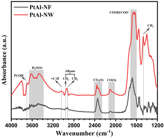 Figure 5 depicts the experimental results of surface species measurement obtained by in situ DRIFTS, displaying the adsorption intensities of each surface species over the 1200–4000 cm−1 range. Broad IR bands in the 3390–3670 cm−1 range represent the adsorption due to the H2O molecule [40,41], with the peak at 3700 cm−1 corresponding to Pt-OH species which showed a higher wavenumber than Al-OH. When the sample was switched from PtAl-NW to PtAl-NF, the IR bands of adsorbed H2O began to decline under the same reaction conditions, whereas the Pt-OH peak vanished completely. This suggested that the γ-Al2O3 nanowires were more hydrophilic inducing the formation of Pt-OH species. As shown in Table 2, the R10 (H2O(S) ↔ H2O + Pt(S)) suggested that adsorption water on the support surface would decrease Pt active sites. The =C-H, -CH3, and -CH2 species were represented by the weak IR bands at 3130 cm−1, 2950 cm−1, and 2910 cm−1 respectively [13,42]. The dehydrogenation of C2H4 (2S) by the surface oxygen adsorbed during the reaction (Pt-O) is thought to be the origin of the creation of the -CH3 and -CH2 species. However, the =C-H species were not seen on the surface of PtAl-NF, indicating that the PtAl-NF catalyst might change =C-H species too quickly for them to be practically observable. The bands about 2350 cm−1 are most likely caused by CO2 [13]. The detected peaks at around 2040 cm−1 and 2110 cm−1 were caused by CO species adsorbed linearly on the Pt [43,44,45,46]. While the peak at 2110 cm−1 indicated linearly adsorbed CO on small Pt particles or single-atom Pt, the peak at 2040 cm−1 indicated the existence of linearly adsorbed CO on Pt particles [44]. The PtAl-NW catalyst’s CO absorption peak intensity was much higher than that of the PtAl-NF catalyst’s, demonstrating the PtAl-superior NW’s CO adsorption capability. Additionally, a bigger Pt dispersion in PtAl-NW was indicated by the peak’s higher intensity at 2110 cm−1, which is consistent with TEM data. The oxidation of the CHX species generated during the reaction may result in the formation of -COOH or -COO− (1600–1700 cm−1) [47].