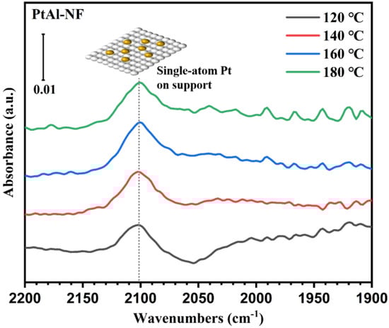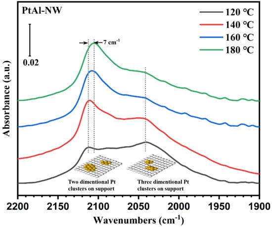 Figure 6 and Figure 7 showed the in situ DRIFTS spectra of C2H4 oxidation on PtAl-NF and PtAl-NW and the corresponding IR intensities of CO as a function of the temperature, respectively. It was found that the PtAl-NF remained almost unchanged when the temperature was raised from 120 °C to 180 °C, indicating that the single-atom Pt (2102 cm−1) indeed lacked catalytic activity for the CO intermediates (Figure 6). Moreover, there were no characteristic peaks (<2100 cm−1) that originated from CO molecules adsorbed on Pt nanoparticles, thereby implying that Pt nanoparticles (~1 nm) could oxide CO and then desorb as CO2 at a reaction temperature above 120 °C. However, as C2H4 was oxidized with PtAl-NW catalyst at elevated temperature (Figure 7), the peaks corresponding to Pt nanoparticles (2040 cm−1) appeared but were reduced in intensity. The appearance of the peak could be ascribed to a higher proportion of <1 nm Pt nanoparticles on PtAl-NW as shown in Figure 8c. Because the smaller Pt particles (<1 nm) indicated lower coordination of Pt and led to stronger interactions between Pt and CO [46]. The PtAl-NW showed a redshift of around 10 cm−1 in the region >2100 cm−1, indicating that the CO molecule was adsorbed on Pt species other than a single atom [43]. Compared with 180 °C (Figure 7), the IR peak was red shifted from 2103 cm−1 to 2110 cm−1 at 120 °C because of dipole-dipole coupling between CO molecules. Single-atom Pt and full exposed Pt clusters had similar CO adsorption properties to single-atom Pt because of the similar low coordination [48]. Based on the IR (Figure 7) and HAADF-STEM (Figure 8c) results of PtAl-NW, the IR peaks at 2103 cm−1 to 2110 cm−1 were assigned to CO molecules adsorbed on full exposed Pt clusters.