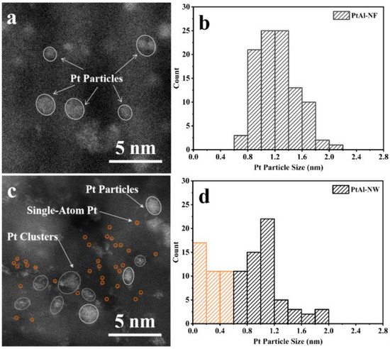 HAADF-STEM images of (a) PtAl-NF and (c) PtAl-NW; Pt particle size distribution of (b) PtAl-NF and (d) PtAl-NW. The count number of Pt particles on each sample was 100.
