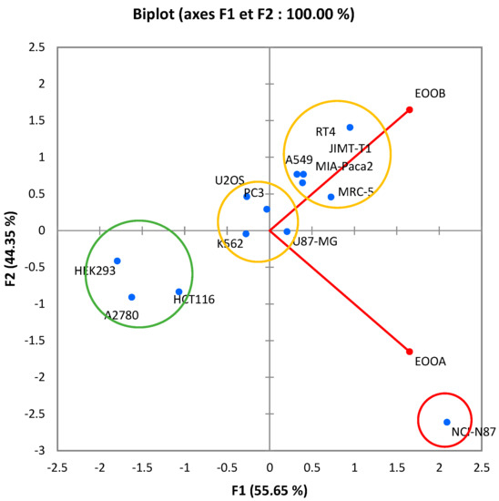 - Group II: Includes three cancer cell lines: HCT116, HEK293 and A2780. This group contains significant IC50 values of both essential oils.