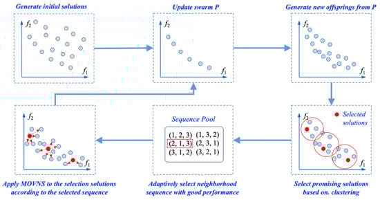To further improve the search efficiency, specific search strategies are designed for the global search and local search, respectively. For the global search, the swarm search is limited to only the set of non-dominated solutions. That is, the swarm consists of only the non-dominated solutions found during evolution, and the new offspring solutions are generated only from these solutions. For the local search, the clustering method is firstly adopted to determine the promising solutions to perform a local search from the union of the non-dominated solutions and the new offspring. Then, the adaptive strategy is designed to select an appropriate neighborhood sequence to perform the local search. Such a strategy can guarantee that the computational resources are allocated to only the promising solutions with good diversity, instead of the whole population of solutions in traditional evolutionary algorithms, which can save computational resources and thus accelerate convergence. The overall framework and the illustration of the above description are presented in Algorithm 2 and Figure 1, respectively.