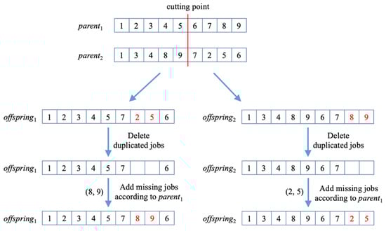 The generation procedure of new offspring solutions consists of three main steps, as shown in Figure 2. Firstly, two parent solutions will be randomly selected from P. Secondly, the one-point crossover will be used to generate two offspring solutions. Once duplicated solutions are found after crossover, a repair procedure will be adopted to reconstruct the feasibility. The repair procedure will remove the duplicated jobs after the cutting point from the offspring and then add the missing jobs into it according to their original sequence in the first parent. Thirdly, the two offspring solutions will be mutated by randomly swapping two jobs.