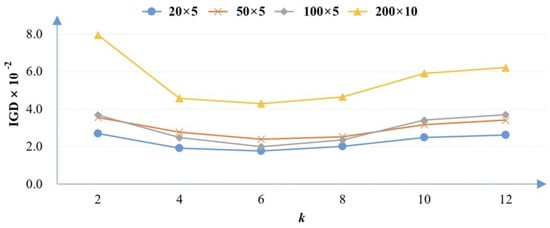 In the proposed LS-MOVNS, the number of clusters, i.e., the value of k in the k-Means clustering method, determines the number of promising solutions for a local search. That is, it directly determines the computational resources required by the local search, and thus affects the performance of LS-MOVNS. Therefore, in this section the efficiency of this parameter is tested and analyzed. The average IGD metric obtained by different values of k (selected from {2, 4, 6, 8, 10, 12}) for the small-size (20 × 5), medium-size (50 × 5), and large-size groups (100 × 5, 200 × 10) are shown in Figure 3.