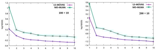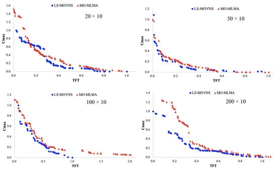 The graphical comparisons of our LS-MOVNS and MO-MLMA, i.e., the evolution process of the IGD metric and the obtained Pareto fronts for some problems, are shown in Figure 4 and Figure 5. In Figure 4, the horizon axis is the CPU time (please note that we have divide the maximum available CPU time into 10 parts so that the comparison can be clear for different problem groups), and the vertical axis is the IGD metrics obtained from the current swarm P for our LS-MOVNS algorithm and from the external non-dominated solution set for MO-MLMA [], respectively. From this figure, it can be observed that our LS-MOVNS has a better convergence speed than MO-MLMA []. In Figure 5, we plot the best Pareto front obtained by our LS-MOVNS and MO-MLMA [] together for four problem groups of 20 × 10, 50 × 10, 100 × 10, and 200 × 10, respectively, in order to clarify the convergence and diversity of the non-dominated solutions in the Pareto front. From this figure, it is clear that our LS-MOVNS has better distribution of Pareto front than MO-MLMA, which further illustrates the efficiency of our algorithm.