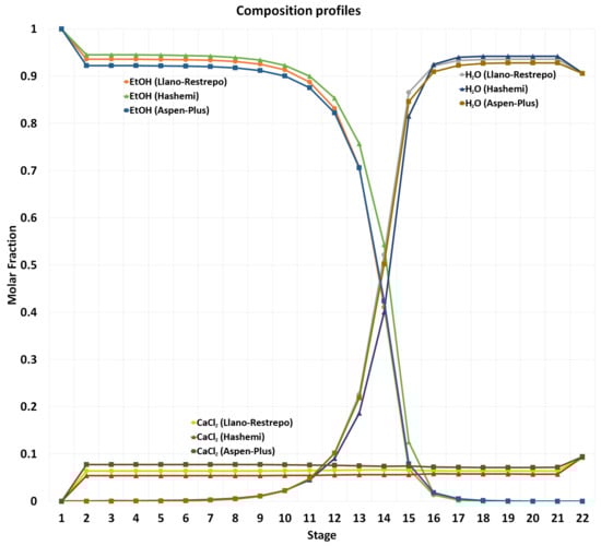 32]. To make this comparison, the activity coefficients had to be estimated in the E-NRTL thermodynamic model of the ethanol-water-CaCl