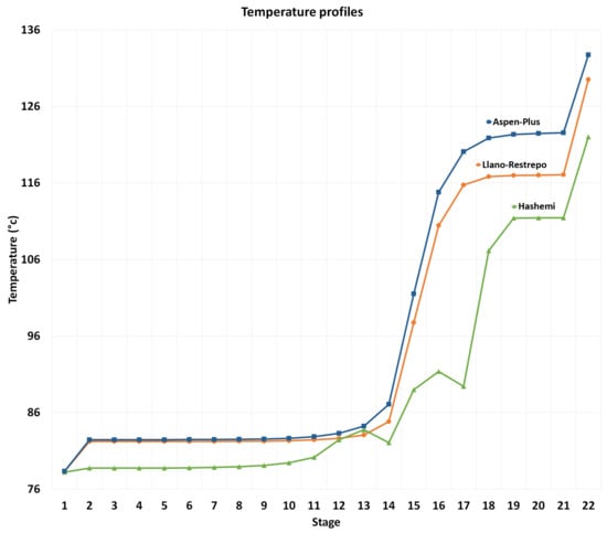 ® RadFrac block, which performs rigorous calculations for columns in ordinary distillation, absorption, desorption, extractive, and azeotropic distillation, three-stage distillation, and reactive distillation applications; it solves MESH equations, including mass balance equations (M), equilibrium relations (E), composition summation (S), and enthalpy balance (H). The distillation simulation is carried out in a steady state, where the molar flows, compositions, and temperatures are analyzed and compared with those reported in Llano-Restrepo et al. [