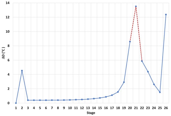 Figure 14, in the same way, the behavior of the process is reported using the structure of a control point called structure D, and it is observed that the composition of the distillate is greater than that reported in the previous structure, with a maximum composition of 99.85% mf but with a drop that is also greater (99.78% mf), and the variation in temperature is greater than 9