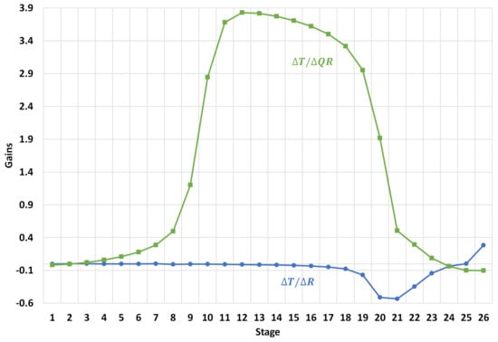 between its maximum and minimum temperature value. On the other hand, the temperature variation in trays 20 and 22 due to sinusoidal disturbances are less than