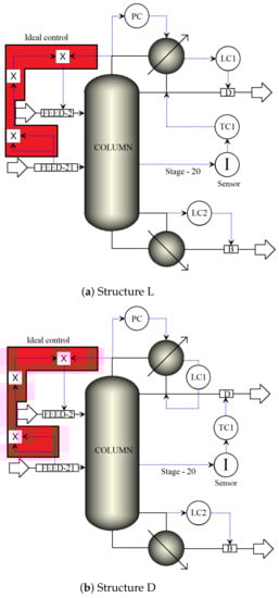 Table 11. Based on this table, it can be summarized that for structures L and D, there is no excess energy consumption, because the temperature of the reboiler is not controlled, it remains constant; however, for structure DV, an increase in energy consumption is reported. The energy of up to more than 200% makes this structure the worst used to control this type of process.