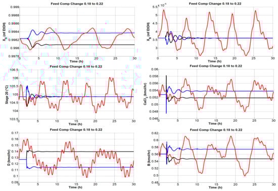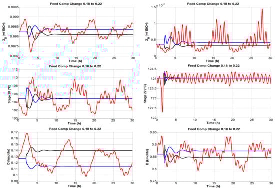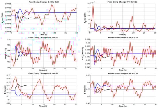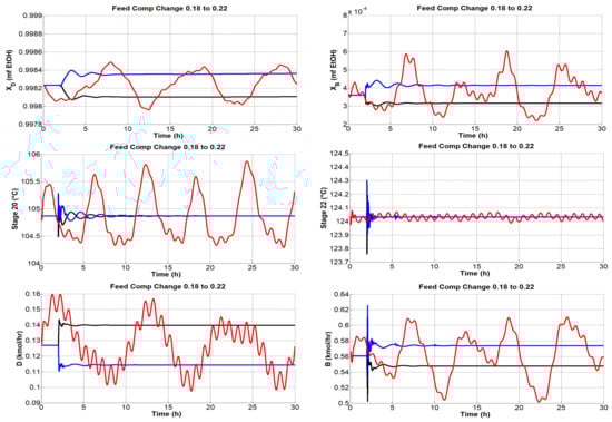 As mentioned above, different types of simulations were carried out, but the graphs only reported disturbances in the composition of the feed.