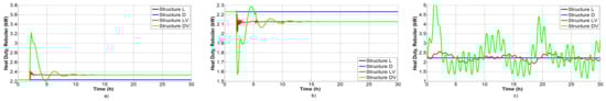 Figure 17 reports the behavior of the reboiler using the four different structures previously described. These figures compare the behavior of each of the structures. To make a better comparison, the maximum and minimum values of the energy consumed are reported in