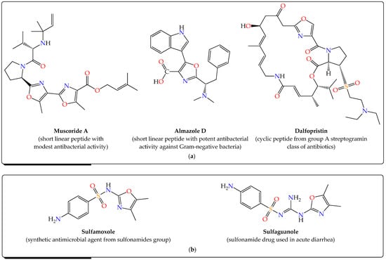 Structures of some representative bioactive compounds sharing the 1,3-oxazole scaffold as antimicrobial agents: (a) Natural or semi-synthetic products; (b) Synthetic compounds.