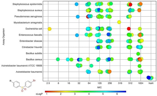 The substructure search based on the common 1-bromo-4-(phenylsulfonyl)benzene scaffold returned 32 compounds with 237 registered minimal inhibitory concentration (MIC) values, ranging from 2.5 up to 1024 μg/mL. All 32 compounds share an R-{4-[(4-bromophenyl)sulfonyl]phenyl} structure (Figure 2). The wide range of the MIC values indicates that the nature of the R group is very important for the potency of the antimicrobial effect. The lipophilic character of the compounds, expressed by the clogP value, seems to confirm the hypothesis of a better antimicrobial effect for most tested bacterial strains (Figure 2). The newly designed bromo derivatives have clogP values above the average of their similar compounds, indicating a potentially improved antimicrobial effect.
