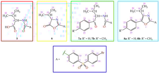 The molecular structures of the new bromine-containing derivatives 5–8 with the numbering of the atoms, used for the assignment of NMR signals, are presented in Figure 3.