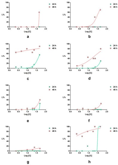 Daphnia magna lethality curves for the tested compounds: (a) 5; (b) 6; (c) 7a; (d) 7b; (e) 8a; (f) 8b; (g) L-valine (control 1); (h) 3 (control 2).