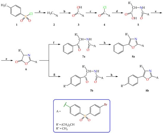 Synthesis pathway for the obtainment of new N-{4-[(4-bromophenyl)sulfonyl]benzoyl}-L-valine analogs. Reagents and reaction conditions: (a) C6H5Br/AlCl3, reflux; (b) CrO3/CH3COOH, reflux []; (c) SOCl2, reflux, 30 h, 99% yield []; (d) (i) L-valine/NaOH, CH2Cl2, 0–5 °C, 30 min; (ii) rt (room temperature), 1 h; (iii) 2 N hydrochloric acid; 94% yield; (e) ethyl chloroformate/4-methylmorfoline, CH2Cl2, rt, 30 min, 90% yield; (f) C6H6/AlCl3, rt, 20 h, 80% yield; (g) C6H5CH3/AlCl3, rt, 20 h, 86% yield; (h) POCl3, reflux, 4 h, 91% (8b) and 94% (8a) yields.