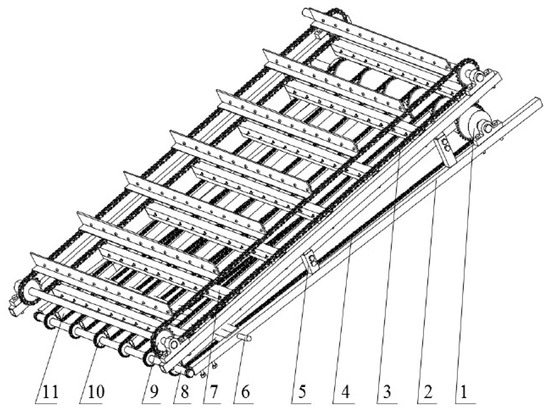 According to Equation (10), when other parameters are constant, the pulling force exerted on the conveying chains of clamp plate increases with the increasing number of clamp plates, which effects the reliability transmission of conveying chains of clamp plate. Therefore, the number of clamp plates should not be too high. Combining the Equations (7)–(10), the number of clamp plates is 9–13, and the speed of the conveying chain of clamp plate is 1.05−1.26 m/s.