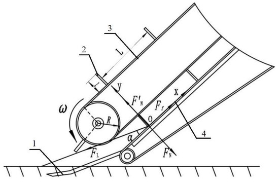 During the process of residual film collection, the cotton stalk is removed using the straw chopping mechanism, and the surface of the mulch film is covered by impurities including cotton branches or leaves, soil, and short straws. The film shovel of the residual film collector driven by the drive system lifts the mulch film. The rotating clamp plate scrapes the film to the conveying chain. The clamp plate contacts the conveying chain and clamps the residual film. The clamp plate conveys the film along the conveying chain into the recycling box. To improve the stability of the residual film, the residual film is clamped between the clamping plate and the residual film conveyor chain. It is necessary to consider the clamping force required for the residual film mixed in the debris to be pulled out. As shown in Figure 2, we established a coordinate system with the tight side contact point of the clamp plate and the residual film conveying chain as the center O and the surface of the vertical film conveying chain as the reference.
