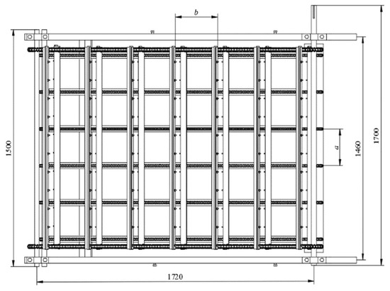 Top view. a = the spacing between two adjacent residual film conveying chains; b = the spacing between two adjacent clamp plates.