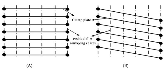 Two arrangements of the clamp plate and the residual film conveying chain. (A) The arrangement of the clamping plate and the residual film conveyor chain is horizontally symmetrical. (B) The arrangement of the clamping plate and the residual film conveyor chain is horizontally asymmetric.