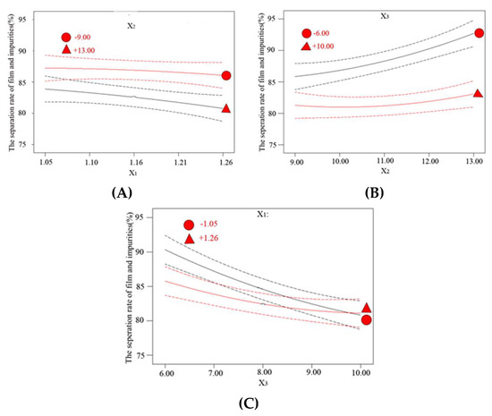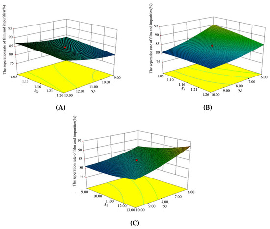 The above results are consistent with the results of variance analysis. In addition, the relationship between the film impurity separation rate and the factors is depicted in Figure 7 [47,48,49,50].