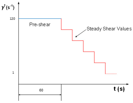 The design of protocols for rheological experimentation with fresh cementitious materials must consider the necessity to minimize the influence on the results of the cement hydration process. In addition, it is mandatory to define the mechanical reference state of the fresh cementitious slurry well to ensure the repeatability of the experimental results. In line with these ideas, the time interval from cement/water first contact to the end of the rheological test must be lower than the induction period of the cement, which is typically around 30 min. Moreover, it is worthwhile to note that the resting state favors the hydration of the cement. Consequently, it is convenient to design the steady flow curve (SFC), a rheological test that records the steady stress response of the material to a series of shear rates monotonously distributed, starting from the higher shear rate value. Therefore, the SFC corresponding to each sample was the plot of the steady shear stress versus the shear rate value monotonously distributed in a decreasing ramp of shear rates from 120 s−1 to 1 s−1, as shown in Figure 5. It is also worthwhile to note that each shear rate was applied during the time necessary to record the steady shear stress response. Only when the relative variation of the stress response to each shear rate was less than 5% for 20 s was the accomplishment of steady condition assured. We present the results of SFCs as the average value of three measurements taken with three different samples of the same cementitious slurry (3 × 3 = 9) measurements. Finally, and related to the design of the SFC protocol, it is worthwhile to note that random stresses can develop in samples during mixing and handling processes that take place in the preparation and positioning of samples before the measuring procedures. Therefore, a pre-shear phase that consisted in the application of the maximum shear (120 s−1) during 60 s was included before the rheological testing to erase undesirable random effects.