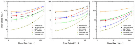 where is the plastic viscosity and is a second-order coefficient with well-defined unities. It is worthwhile to note that some physical and practical meaning could be tentatively ascribed to the three parameters that appear in Equation (2). First, the yield stress relates to starting flow ability and stability and the resistance to segregation of cementitious materials when they are in an at-rest state [25,26,27]. Second, the plastic viscosity characterizes the pump ability and the resistance to segregation when the material is flowing [28]. Third, as the second-order coefficient value depends on the existence of inclusions–matrix interactions, its value and sign can supply information on the complexity of the viscoplastic behavior, which manifests as a non-linear dependence of the shear stress with the shear rate [29,30,31].